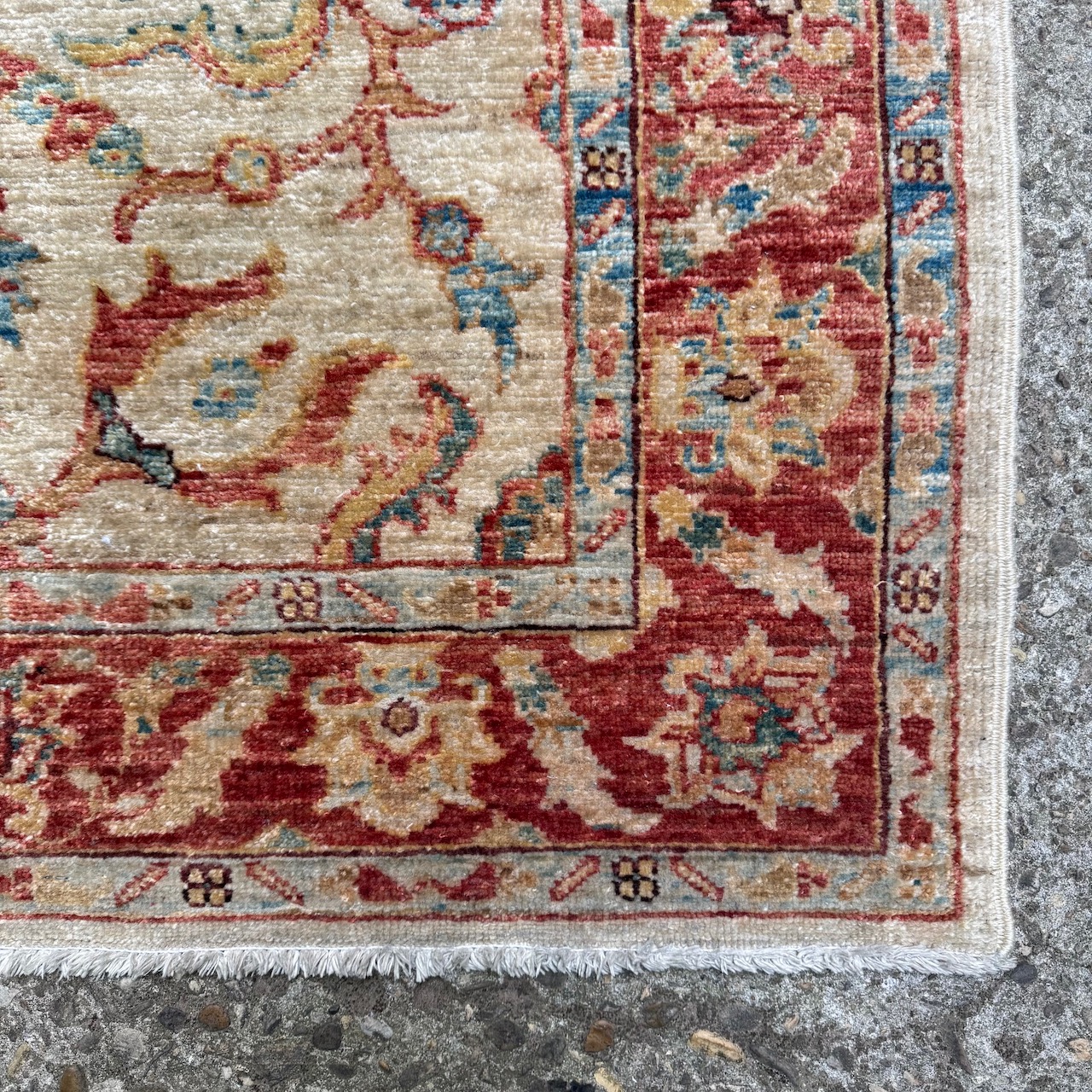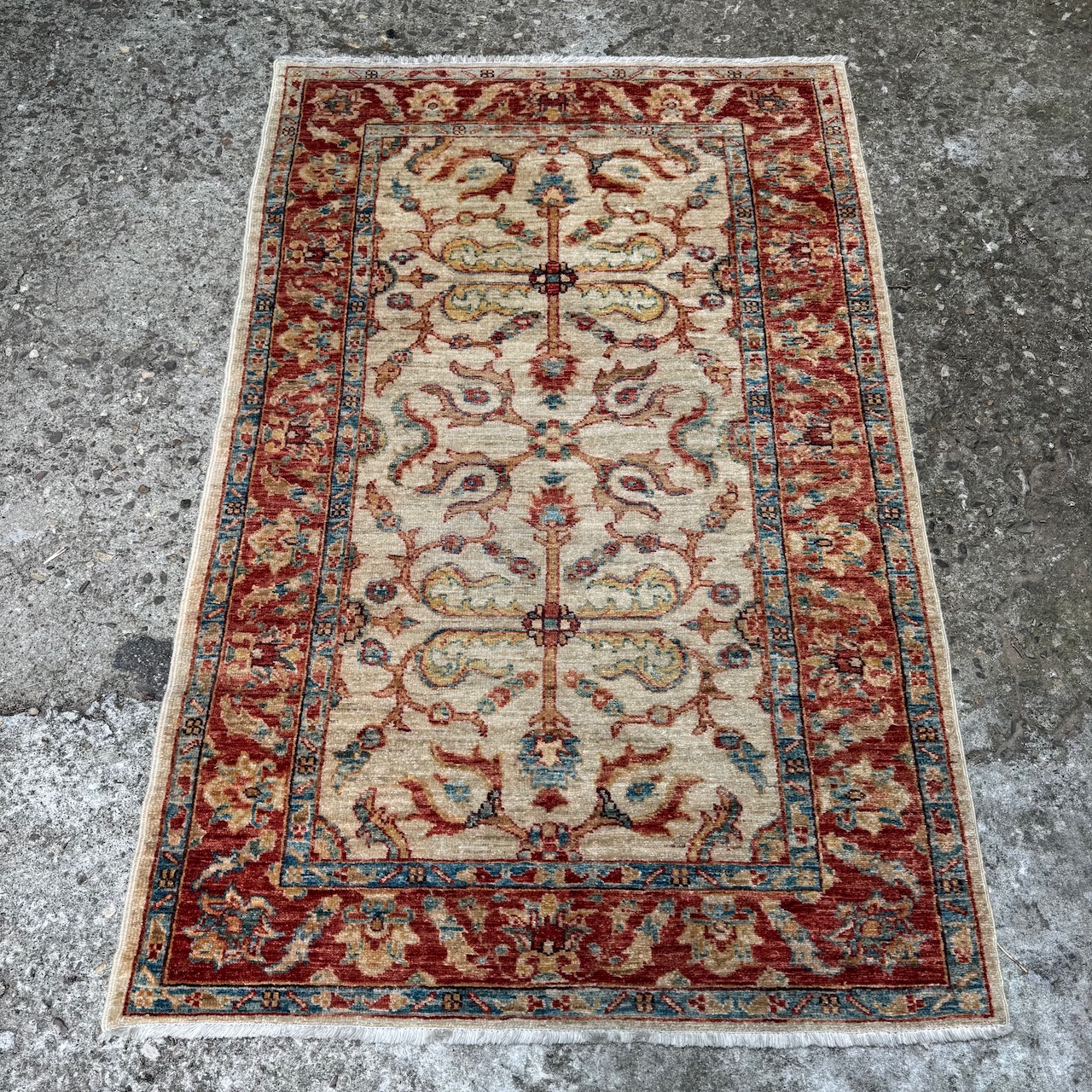 Tappeto Pakistano, annodato a mano, a fondo chiaro, bordo bordeaux. Pakistan, sec. XX