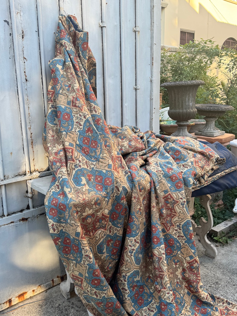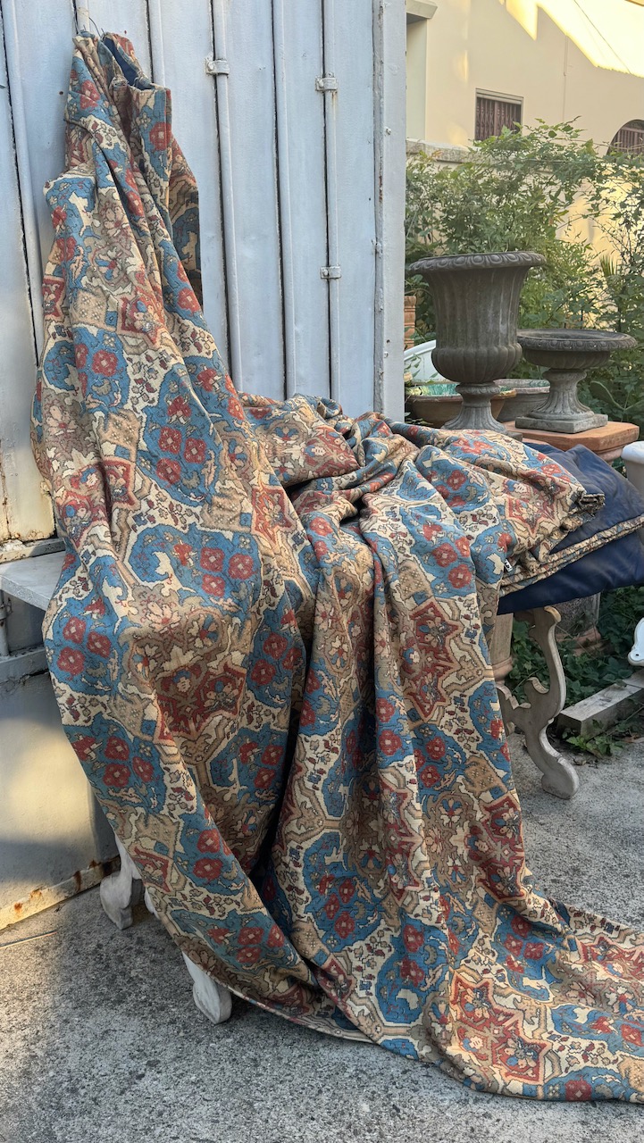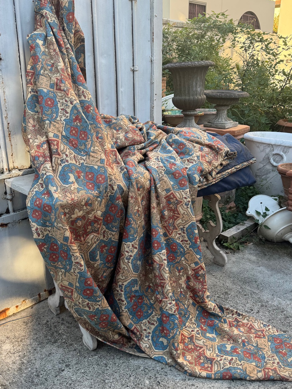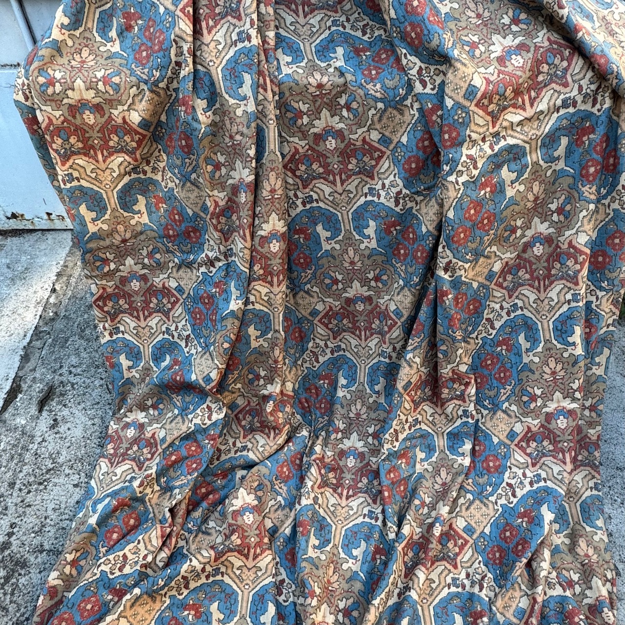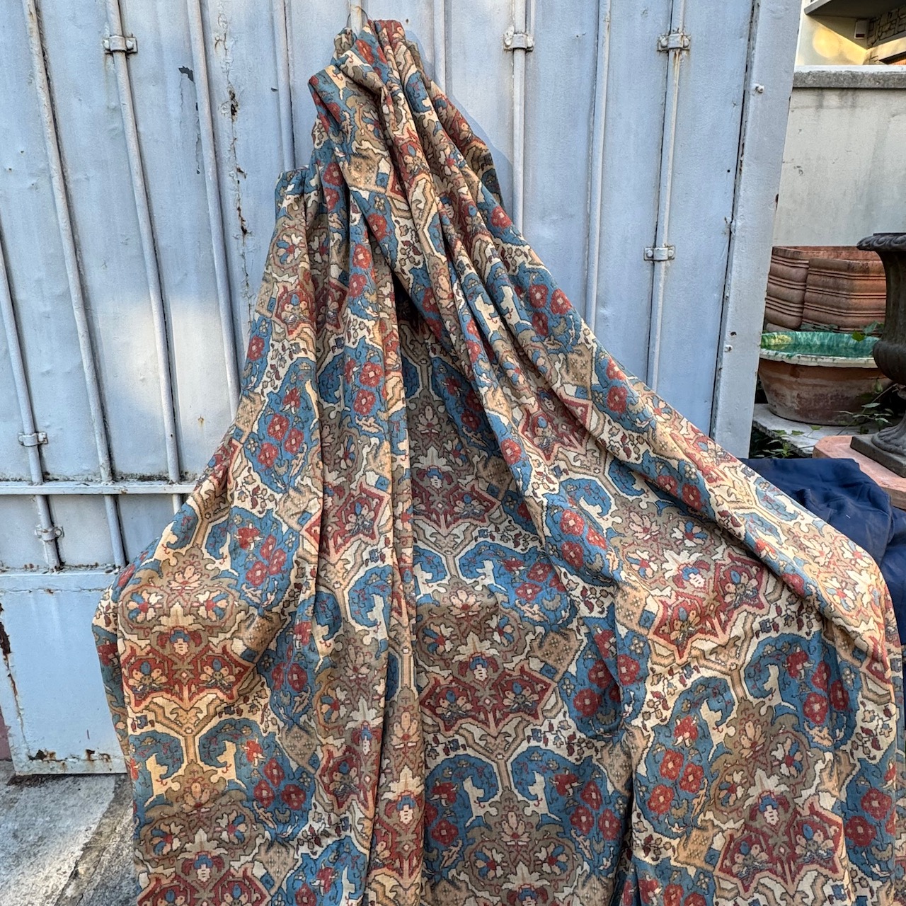 Coppia di tende in tela di lino jacquard fondo ecru, foderate in rasatello di cotone blu cobalto. Italia, sec. XX