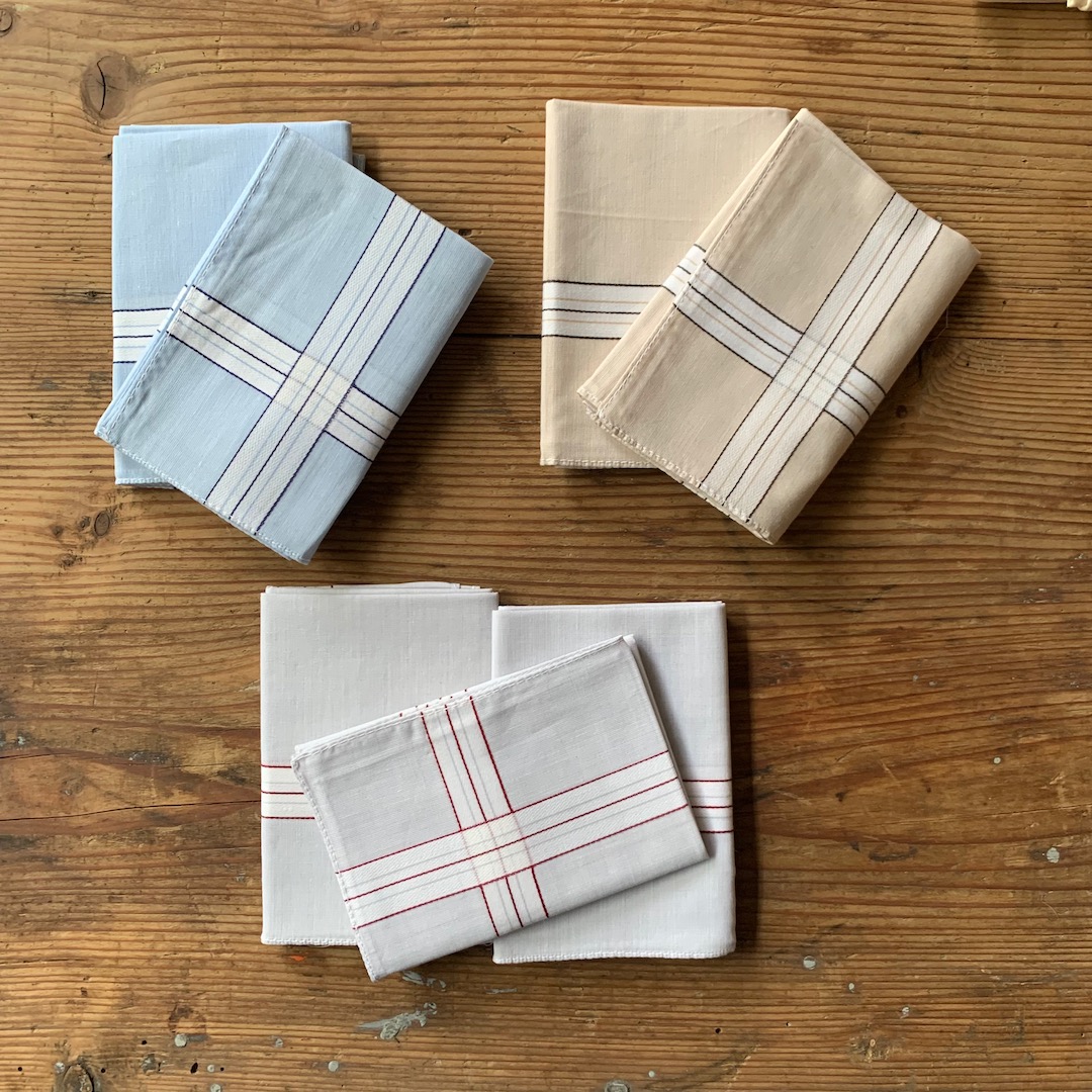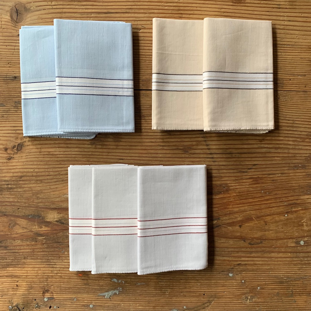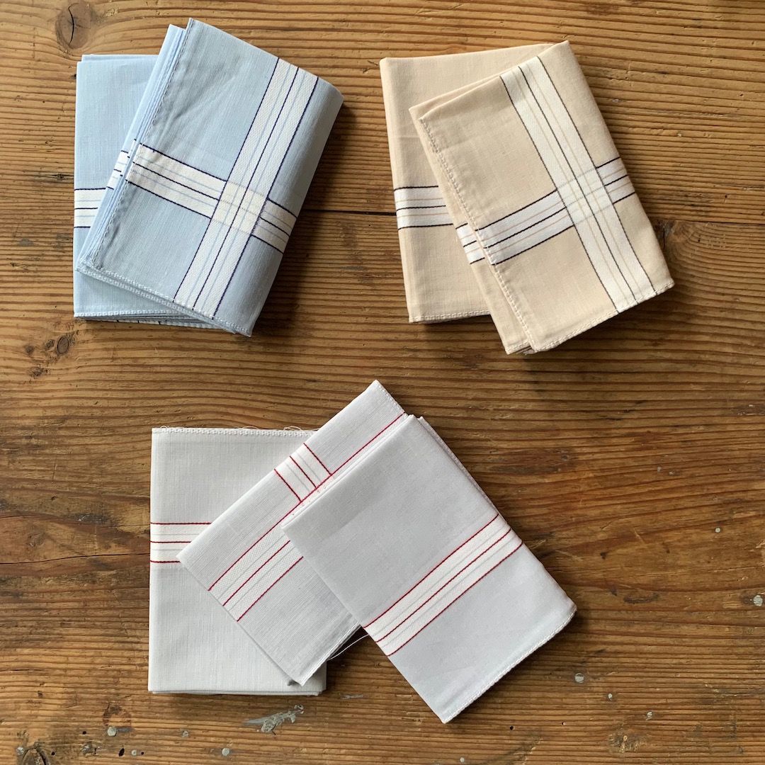Sette fazzoletti in cotone con riga, bordo a cornice, fondo azzurro, crema o grigio. Italia, sec. XX