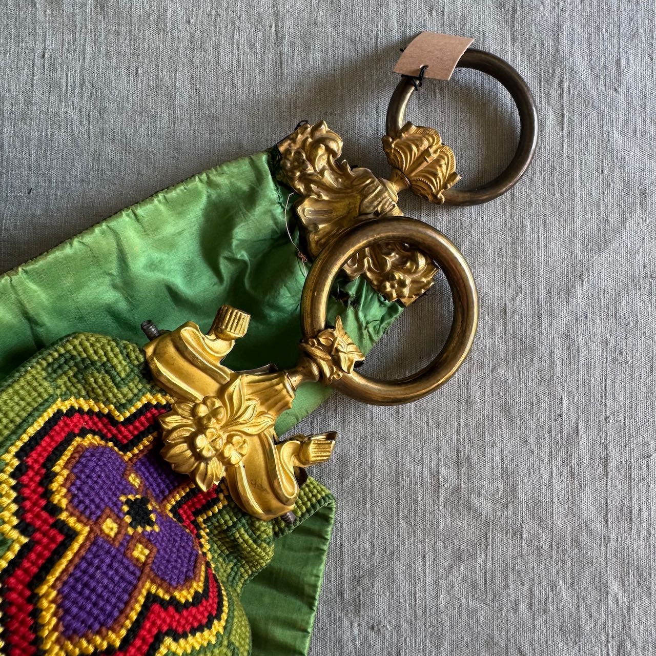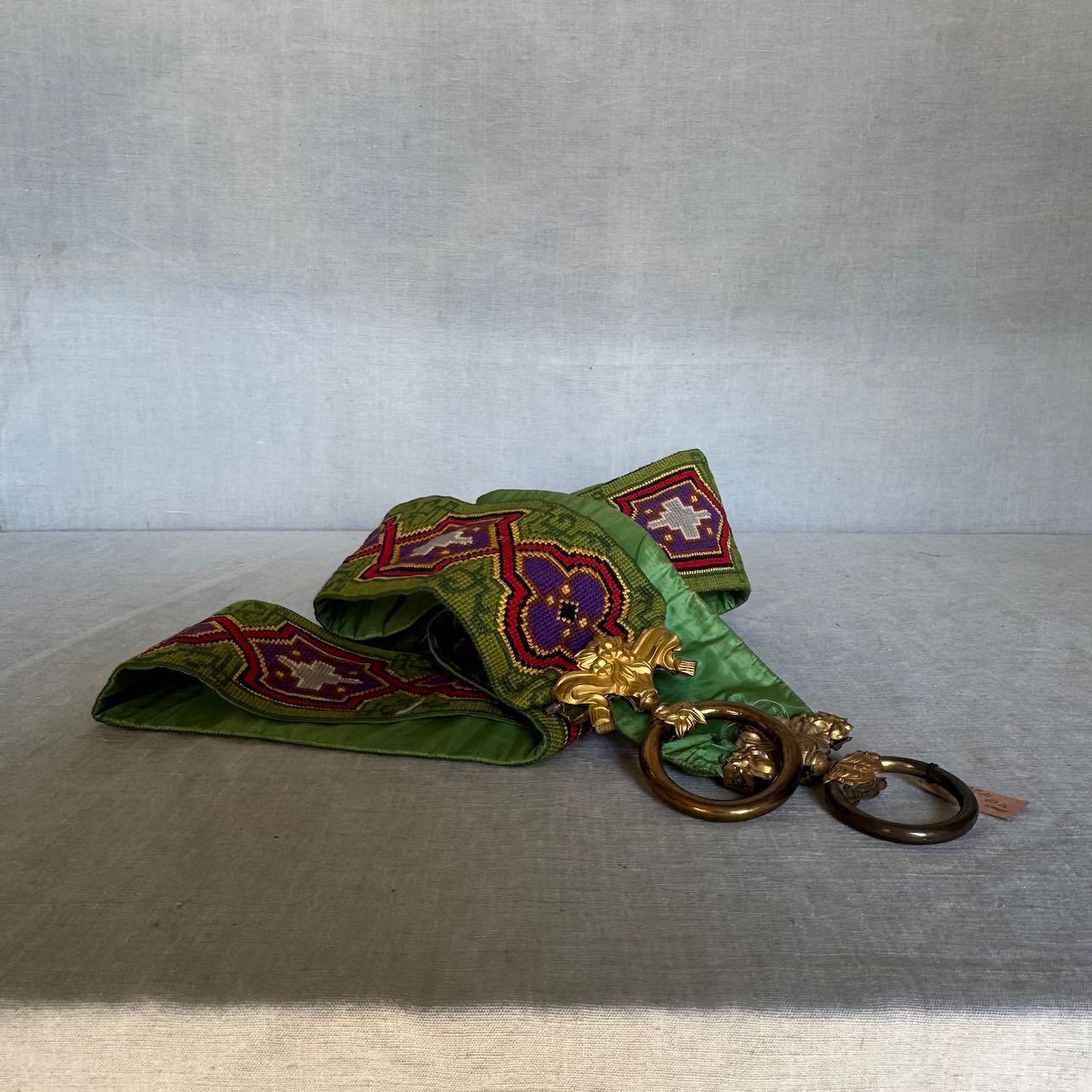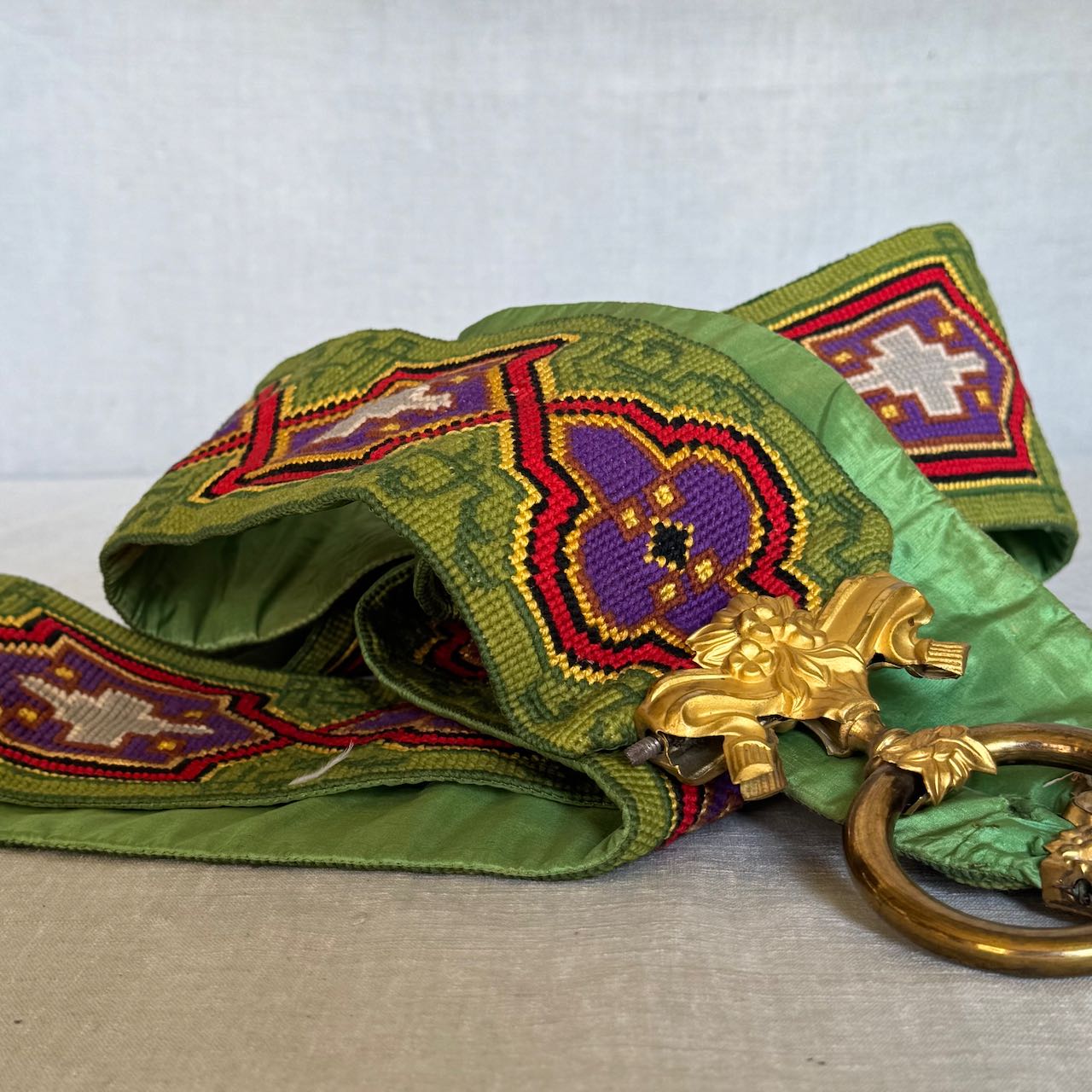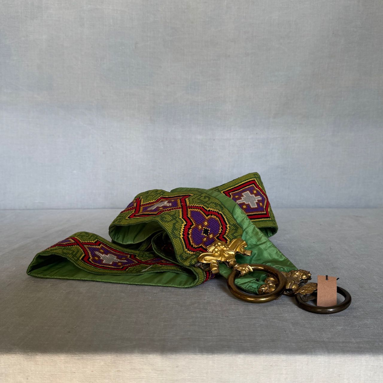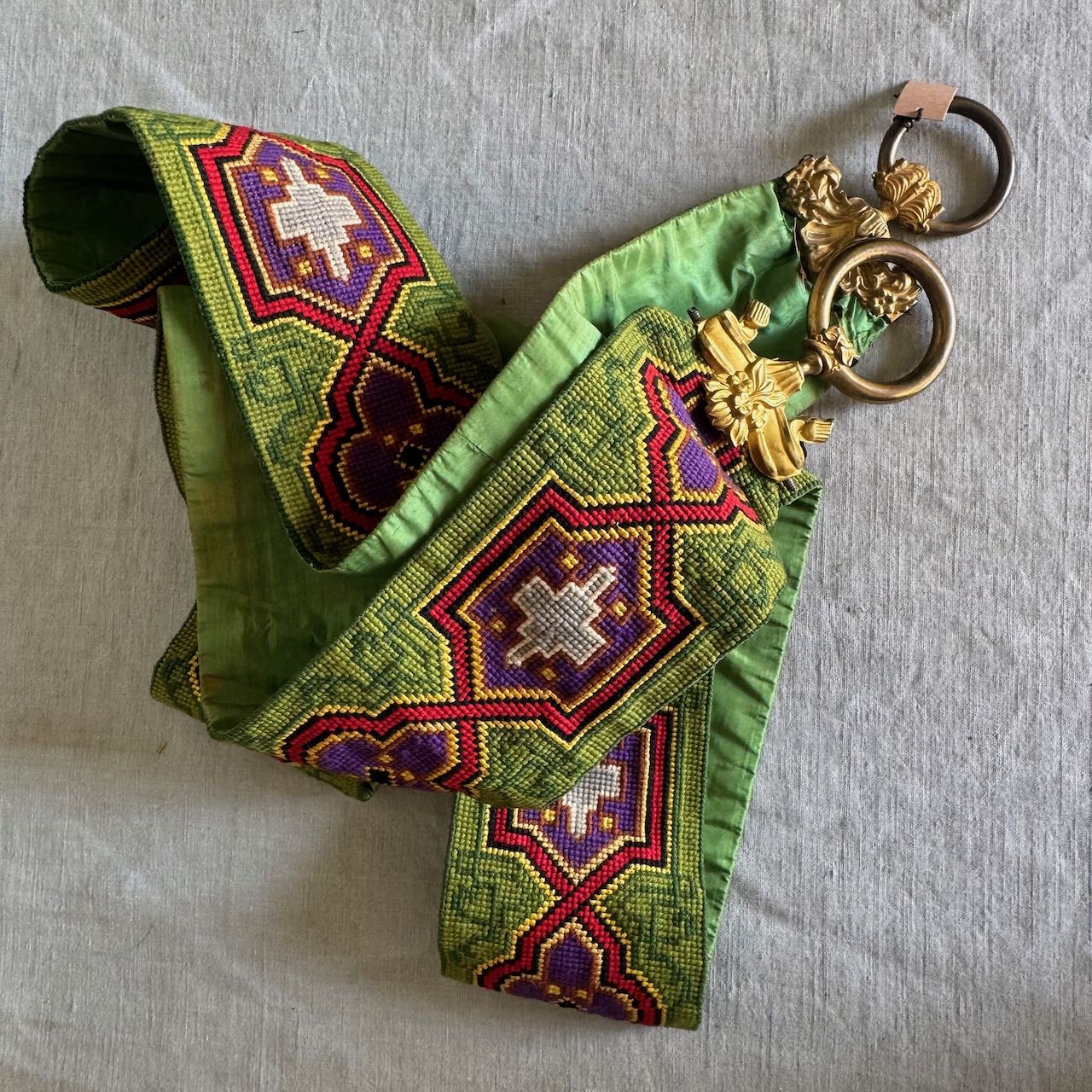 Nastro ferma tenda, punto croce con decoro geometrico policromo, anelli in bronzo dorato. Italia, sec. XIX